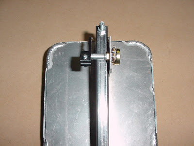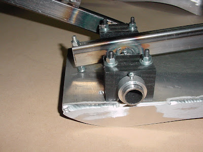 This shows the countersunk screws going through the rudder pedal to the bearing blocks. Also, you can see the bearing blocks at the bottom of the rudder arm.