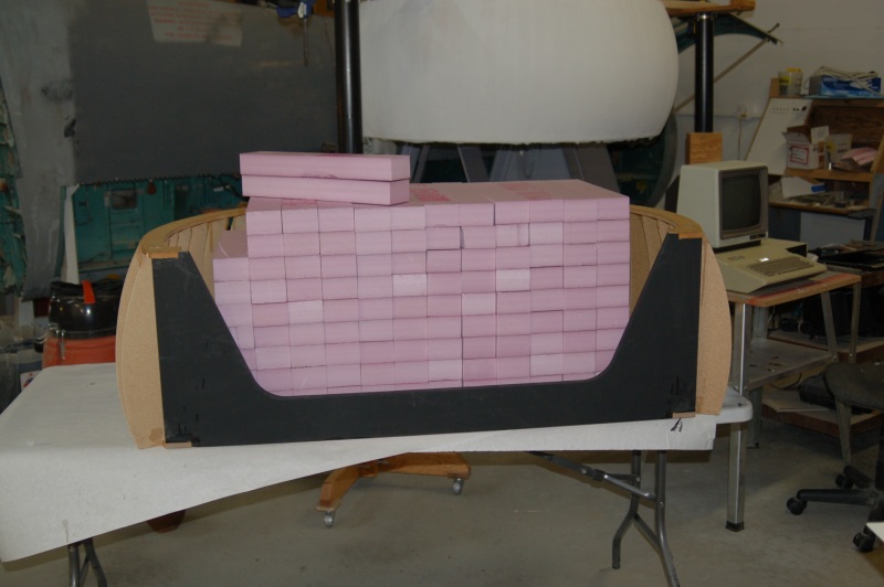 We got the foam blocks cut for the screen.  That stack of material used to be four 96" x 24" sheets.  Wayne built a slick jig that allowed them to be bevel cut without getting your fingers too close to the saw blade.