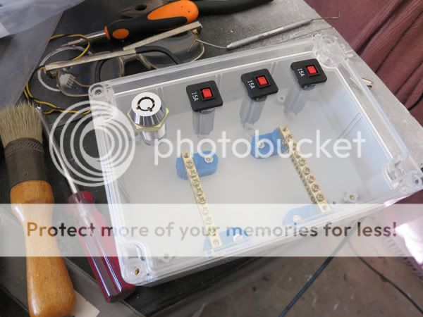 So, I bought a distribution box and mounted two rails (I blew it, I now find out I've left out the negative rail, so I'll be correcting that on Tuesday) and then instead of fusible links I bought circuit breakers, which were also mounted in the lid of the box.