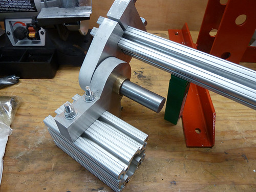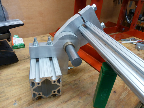 Here is the assembled hinge.  For final assembly I will mill the bushings flush, install needle thrust bearings in the middle and on both sides of the hinges, and use shaft collars to keep everything in place.