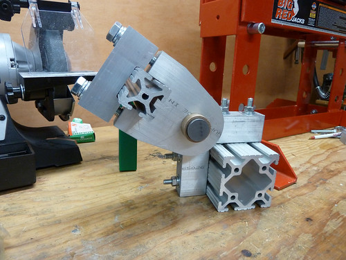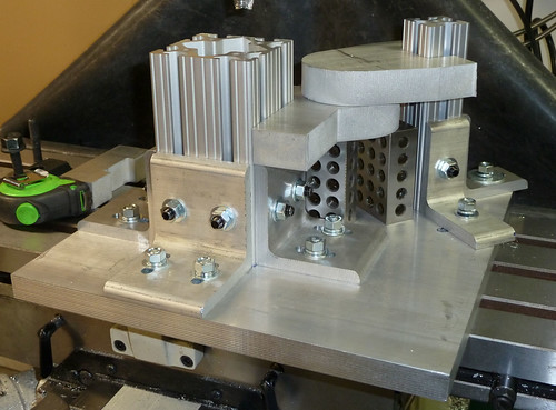 The basic platform will be constructed using 80/20 and one of the many parts I need are very strong hinges that will become part of four anti-yaw assemblies.  I designed the hinges and had the individual pieces cut out of 1" aluminum by water jet.  Here I've made a jig to hold two hinge pieces in place: