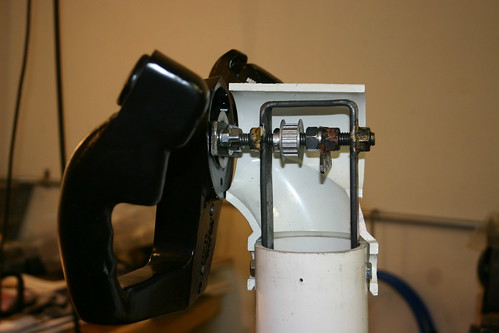 Also, although not perfectly scale on the column top, this design can allow for a different type top to be molded later if desired.  I am happy with this semi-scale look and after I put the decal for the roll degrees on the top and paint this Boeing Gray I am sure I will never notice while flying.    Note also that there is a gear for driving a pot with a small belt which I have not added yet (Grainger item 2L519 http://www.grainger.com/Grainger/wwg/search.shtml?searchQuery=2L519&op=search&Ntt=2L519&N=0&sst=All ).  This will connect to a second pulley and pot further down inside column.  You will also see the control horn that will work the cables and a tension/centering spring. This part also acts as a hard stop for rotation of the yoke at aprox 180 degrees each way.  This whole design by the way has no play and is very strong.  The steel bar is 3/16" x1".  The top threaded rods and nuts are 7/16.  The bottom nuts and bolts holding to the column are 5/16.  Pipe is 3" PVC as is top part.