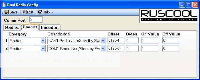 The radio style I want to use is in the attached pic. I cant figure out what FSUIPC settings to use for the top panel Com 1&2, Nav 1&2, and ADF buttons to select the appropriate one for tuning. I tried Com_Radio_Set, Com2_Radio_Set, Nav1_Radio_Set, and Nav2_Radio_Set, but nothing happens. Do I need additional parameters? I have found the proper settings for the Com and Nav tuner swap, and for the tuner knobs.