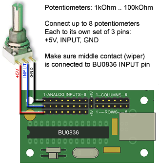 Isn't that for rotary encoders?  The BU0836X board has 8 analog inputs (3 connections for each; axis, 5v and ground) so that's where I hooked up the pot.