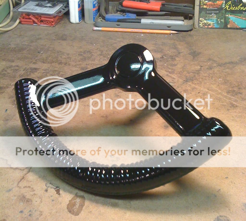 These photos show three coats of black acrylic lacquer and six coats of clear coat on the tiller. I'll shoot three more coats tomorrow morning and start wet sanding and then polishing Tuesday morning.