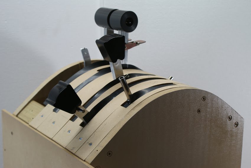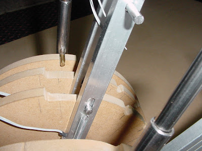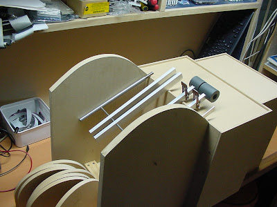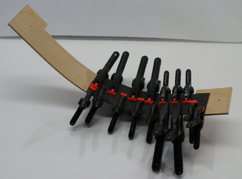 Thin strips of MDF (approximately 3.2mm thick) were then cut and formed into the correct arc by wetting them with hot water and clamping them across the top edge of the side wall. Once they were damp they went soggy and could be formed into shape very easily. After this process, they were then left to dry and harden for several hours.