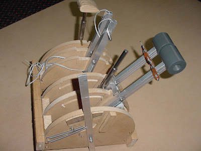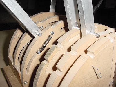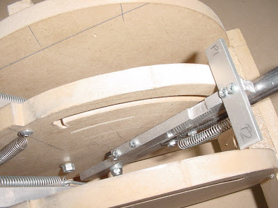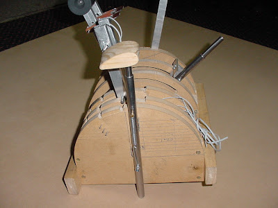 The next photo is from the lower rear and shows the notches that the various levers slip into.You can also see the return spring for the throttle reversers. The row of three small nails was a temporary stop for the flap lever, which eventually had a small wooden block glued and nailed into place.
