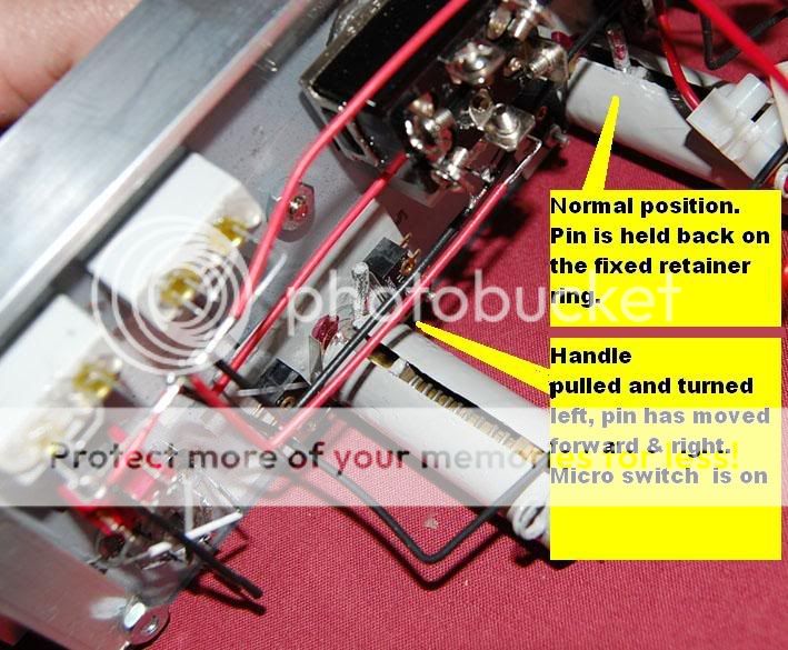 2) A pin, inserted in the rod, travels forward and left or right in the T shaped channel of the tube, guiding the Handle to do what it is supposed to. (being pulled and turned either side)