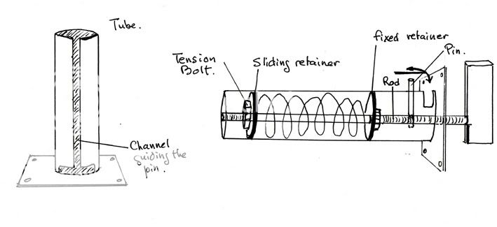A threaded rod which links at one end with the Handle is inserted in a tube, with a spring contained between a sliding retainer (which moves in the tube) and another one fixed to the tube. .