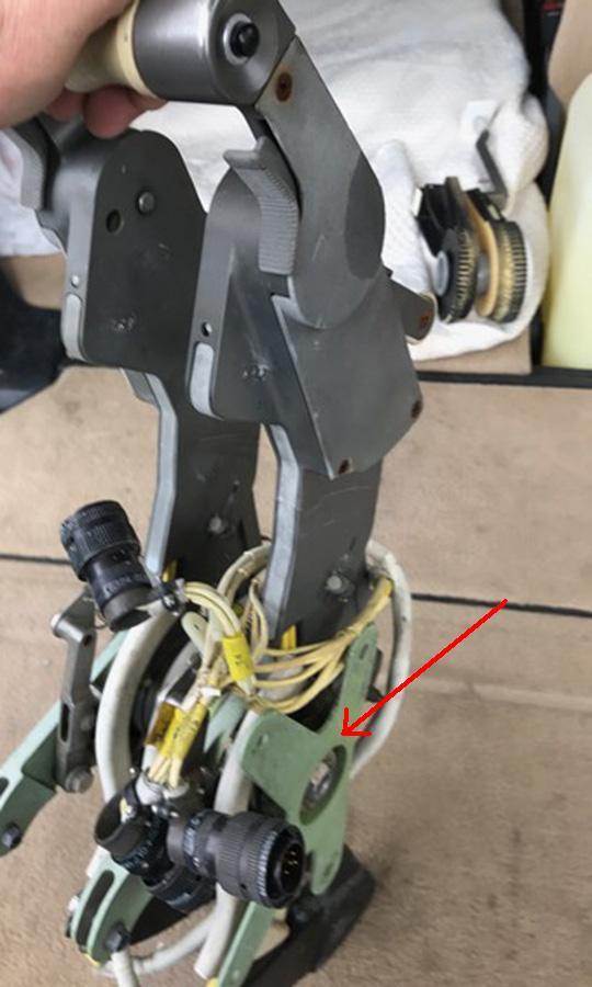 The "skid plate" is actually designed as cam that pushes a follower when either reverse lever is moved up to reverse idle and onwards to full reverse. The follower actuates a lever that raises the spoiler handle out of its down detent so that the spoiler motor can deploy them. This ensures spoiler deployment even if they were not armed.