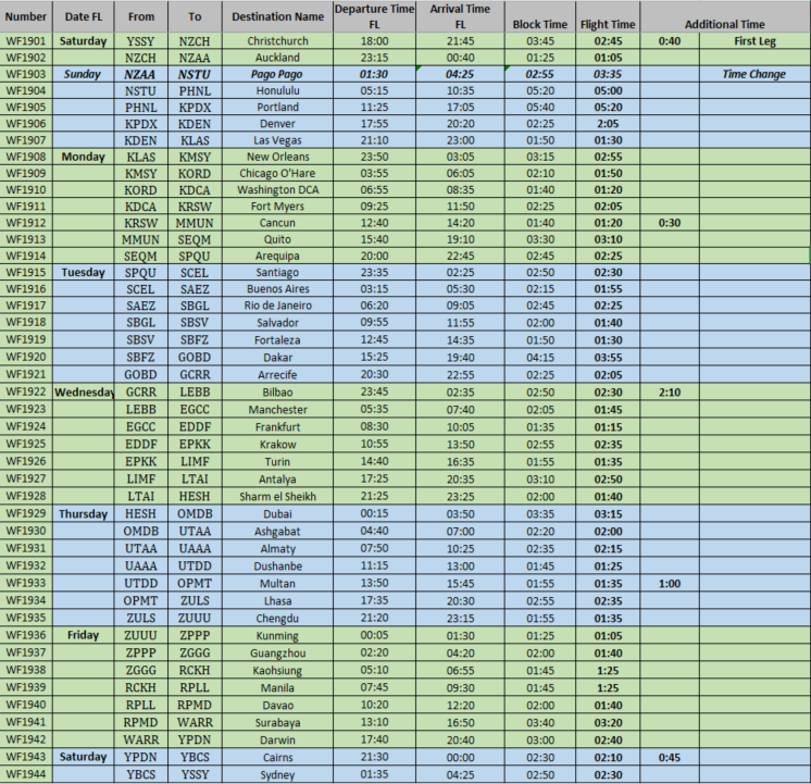 Suggestion:  For the two 5+ hour flights on Sunday a dual crew assignment might be advisable.....those are both long, boring stretches over ocean.