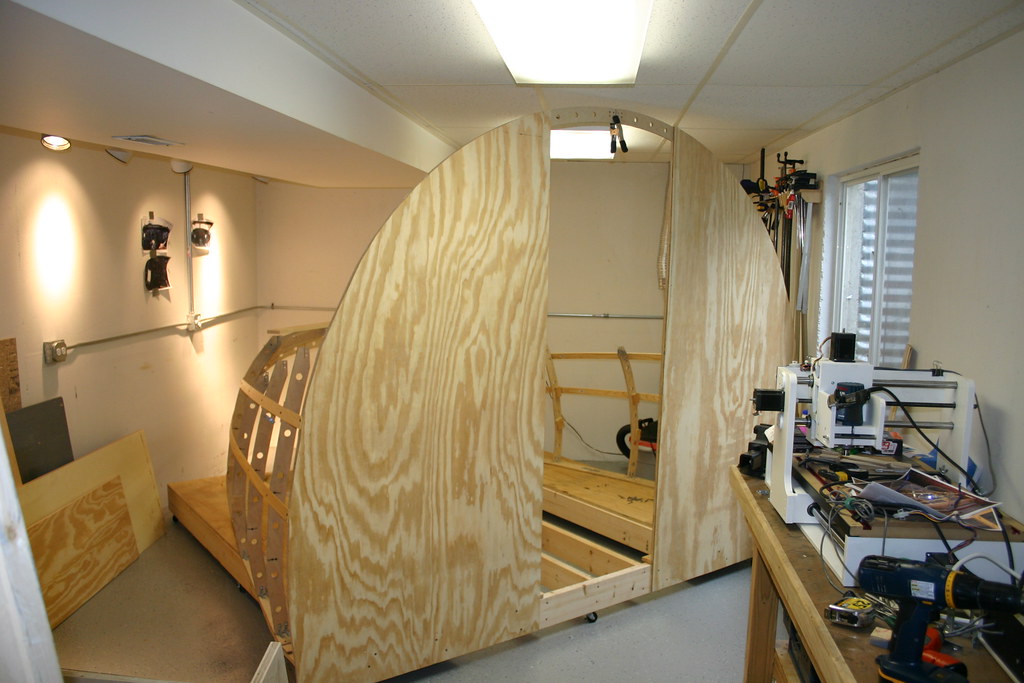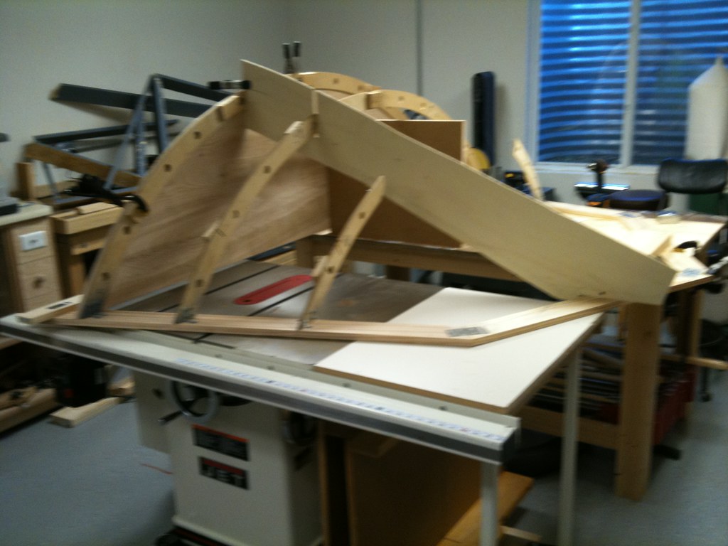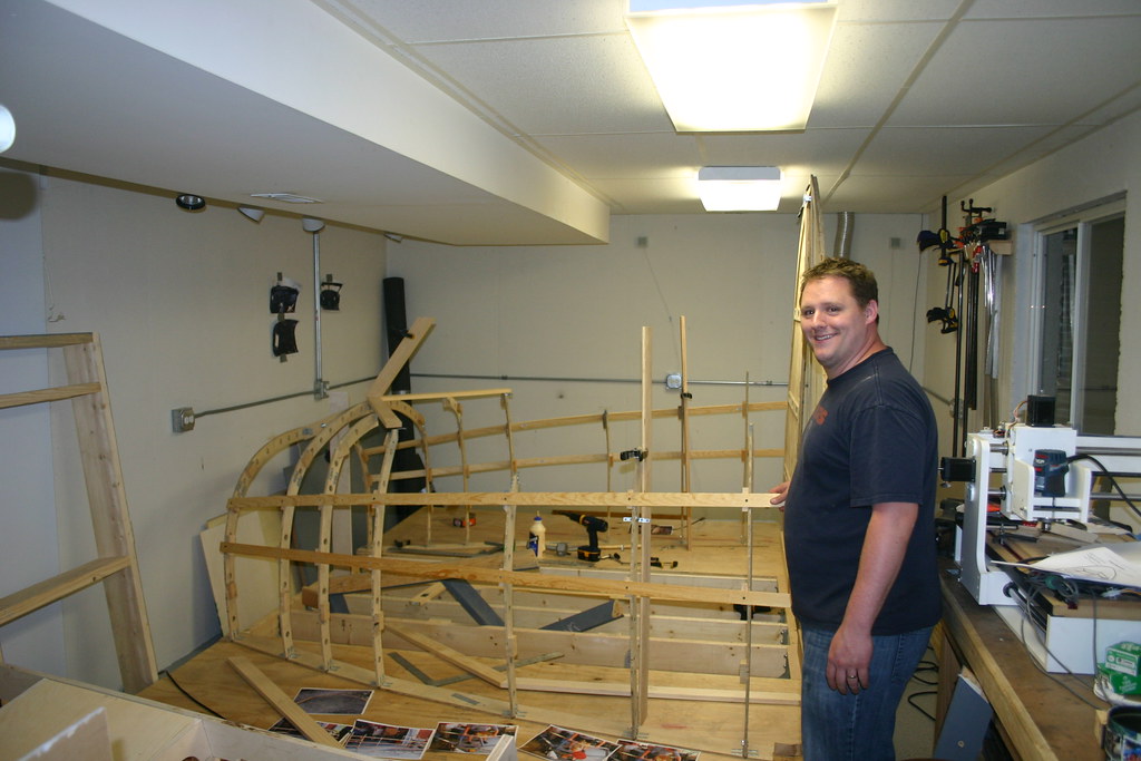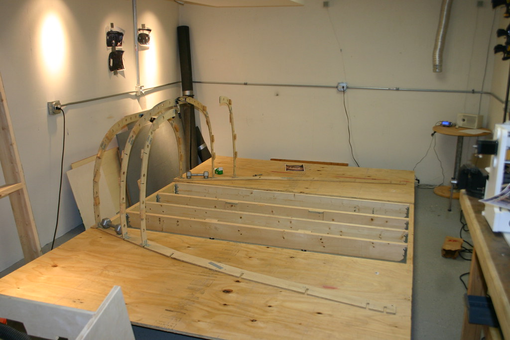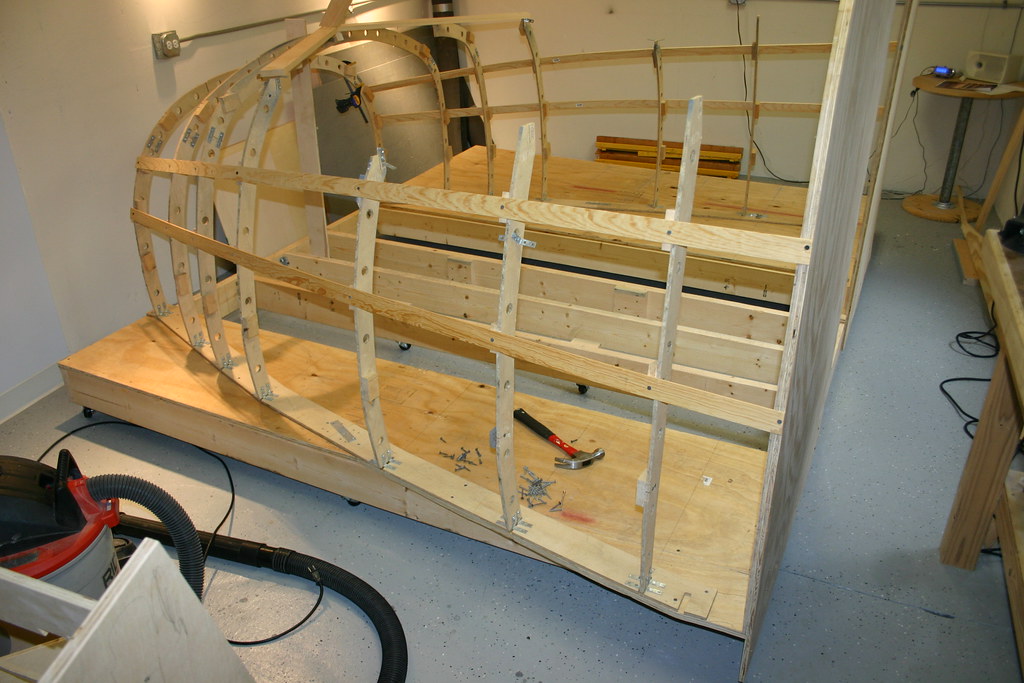 Well, finally got started on a shell.  This is the Flightdeck Solutions old wood ribbed shell.  I picked it up from someone who wanted to get rid of it and am working on piecing it back together my way.   I am going to remake the window frames as I wasn't happy with the ones that were with it and as some of you know this is tricky but having the basic shape really helps and hopefully will have them done in the next week.   I decided based on advise from Ivar to try and angle it into the corner of my room and it worked out perfect.  This will allow me to have a 6-7ft radius screen going around the nose for the projection and I hope to get 180-225 degree wrap around with TH2GO, NTHusiam, and 3 DLP WXGA short thow projectors.  All in good time.