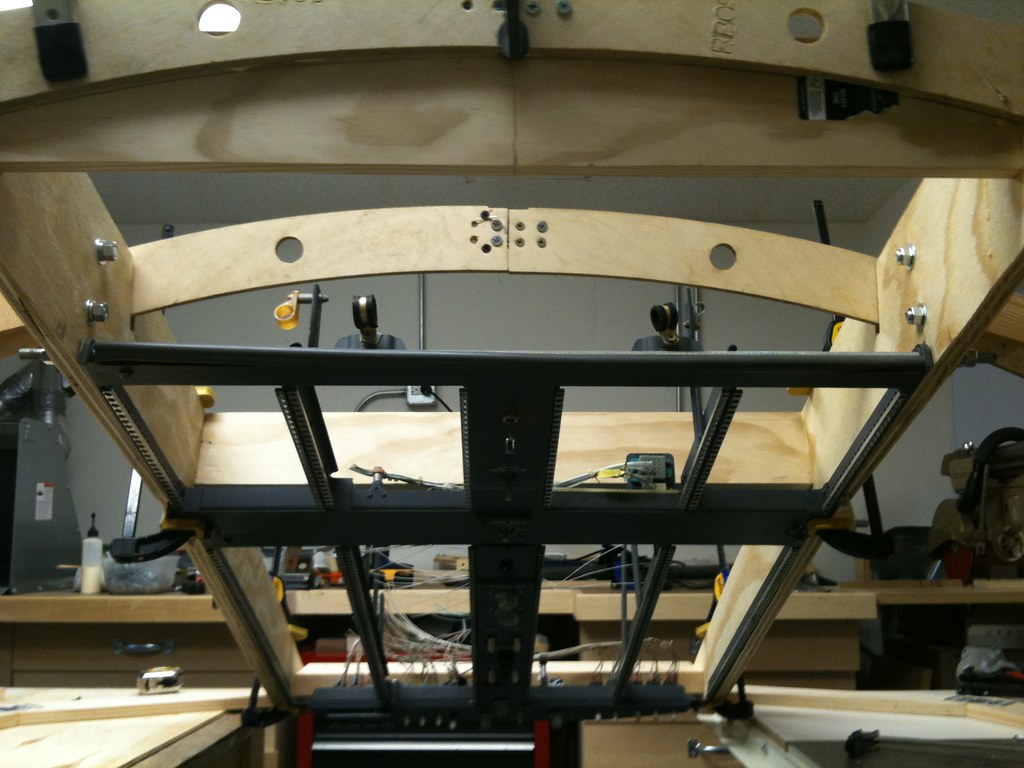 I am on vacation this week and just got back in town yesterday.   Had a chance to get back in the shop last night and make more progress working on the upper shell piece including the overhead frame hanging.    I managed to get both overhead frames fitted along with brackets for the safety latches which work perfectly.  I have to do this very carefully with lot of planning as I have to fit the authentic eyebrow window frames and overhead panels next.