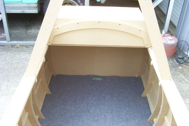 He's using an indoor/outdoor carpet from Home Depot for the interior (runs about .49c per square foot)